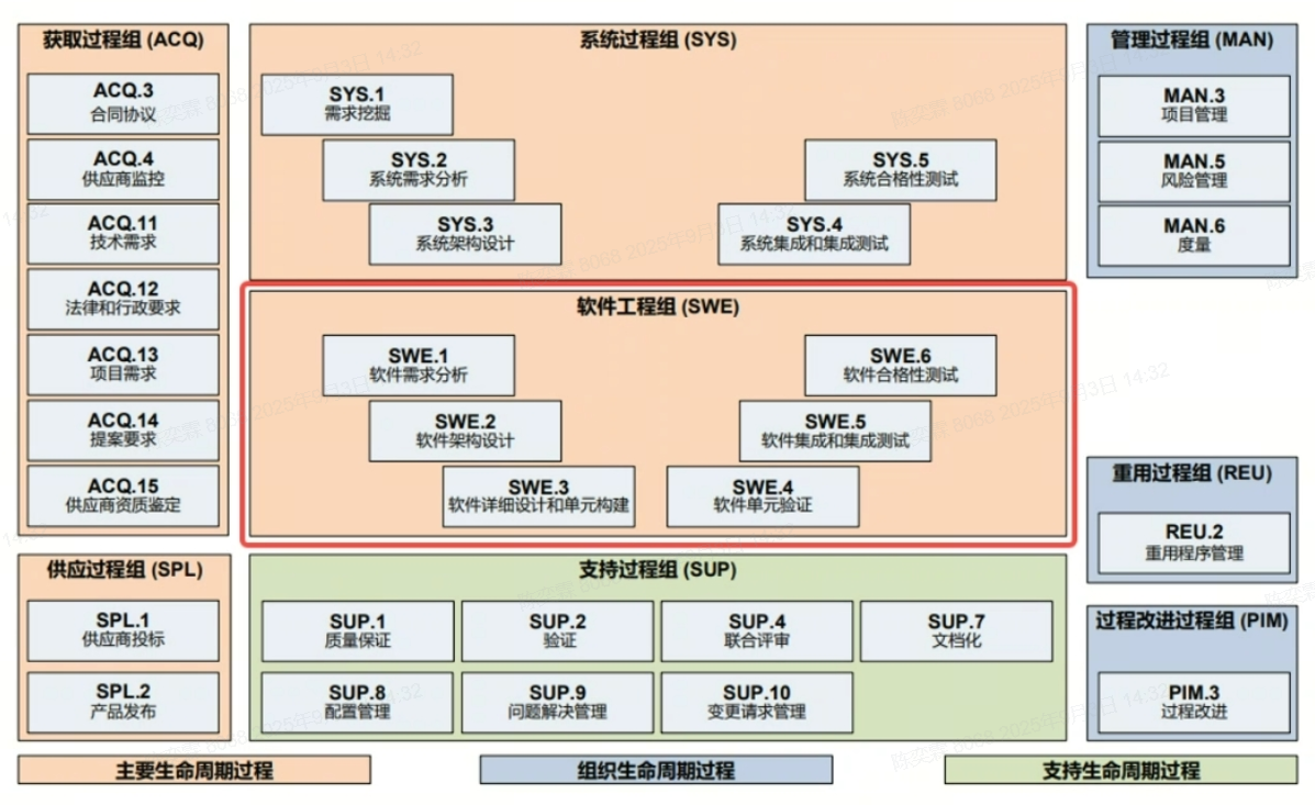 ASPICE 将开发与管理工作划分为 3 大类、共 32 个过程,每个过程均给出明确的目标、基线实践与输出工作产品,从而保证从“需求→设计→实现→验证→交付”的端到端可追溯性。