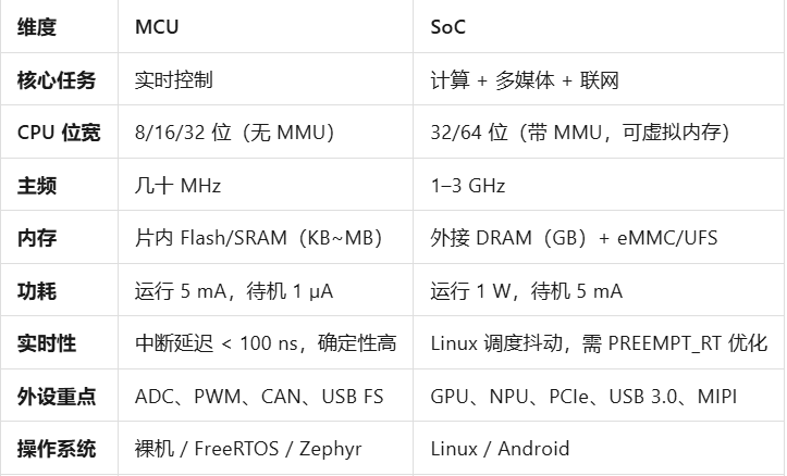 SoC(System on Chip)= “把一台电脑的主板塞进一颗芯片”。除 CPU 外,还集成 GPU、NPU、基带、内存控制器、视频编解码、高速接口等,可直接跑 Android/Linux。典型代表:高通骁龙 8 Gen3、苹果 M2、树莓派 BCM2711。