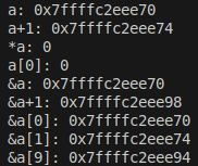 printf("&a: %p\n",&a);//&a类型是 int (*)[10],指向整个数组,它的值和a(即&a[0])是相同的,但是类型不同,可以比较a+1和&a+1的区别
