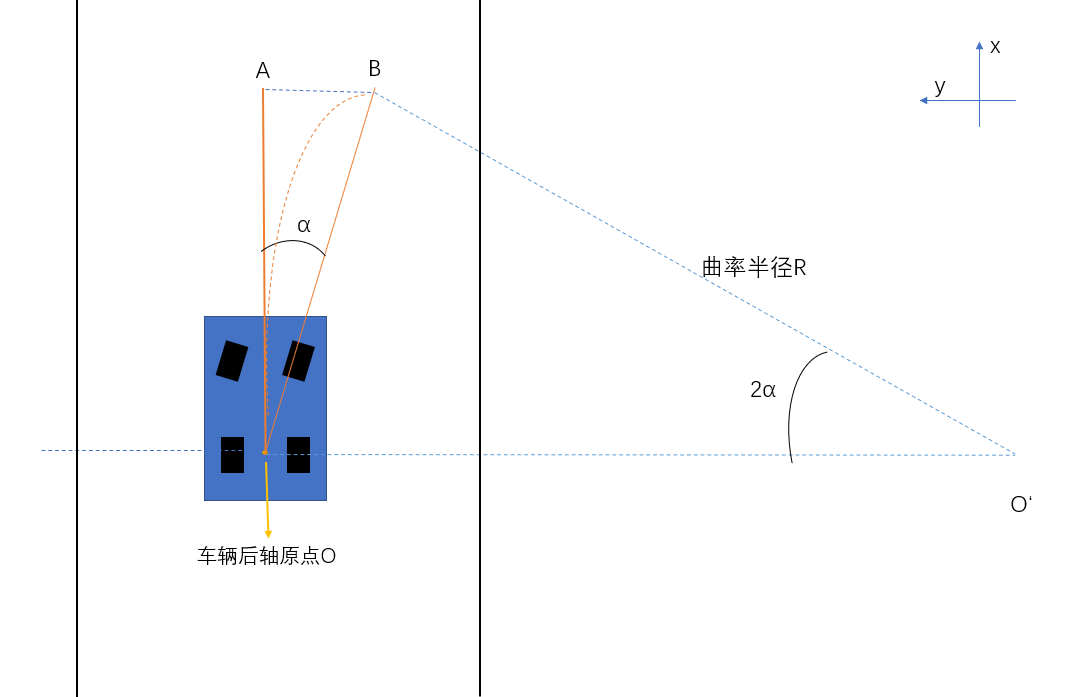 假设场景如图所示,两条黑色直线为路沿,车辆在当前道路行驶过程中,方向盘发生向右偏移,车辆将沿曲线OB进行行驶,我们需要得到横向偏移误差和航向角偏差