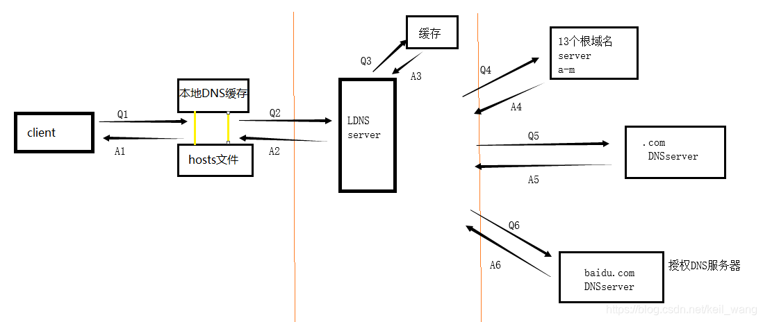 本地DNS缓存/Hosts文件-----> LDNS -----> 根域名DNS ------> .com DNS ------> baidu.com DNS