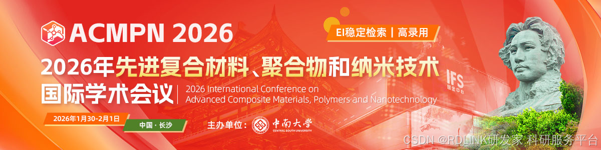 2026年先进复合材料、聚合物和纳米技术国际学术会议(ACMPN 2026)将于2026年1月30日至2月1日在中国湖南省长沙市召开,由中南大学主办。会议旨在为来自材料科学、机械工程、化学工程、能源技术以及相关交叉领域的专家、学者和产业界人士提供一个高水平的国际交流平台,聚焦先进复合材料、高分子材料及纳米技术的最新研究成果与前沿发展趋势。