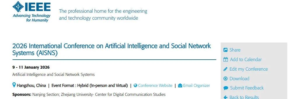 2026年人工智能与社会网络系统国际会议(AISNS 2026)。该会议将于2026年1月9日至11日在中国杭州举行。在数字化转型的时代背景下,人工智能(AI)已成为推动社交网络系统发展的核心驱动力,深刻改变了人们的连接、沟通和互动方式。人工智能与社交网络的深度融合不仅为智能算法的创新和用户体验的提升提供了广阔空间,还为应对数据安全、隐私保护以及伦理规范等关键挑战创造了重要机遇。