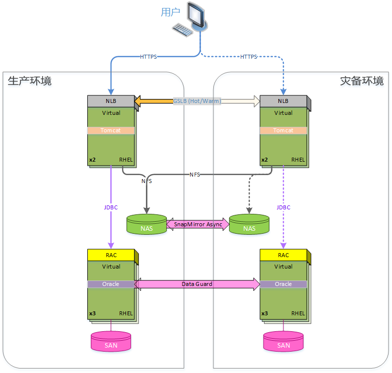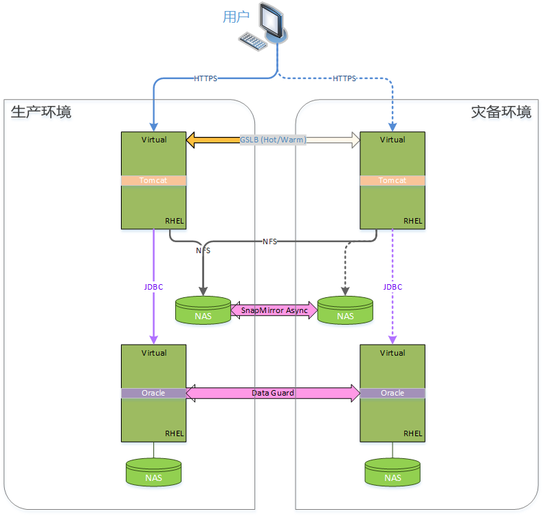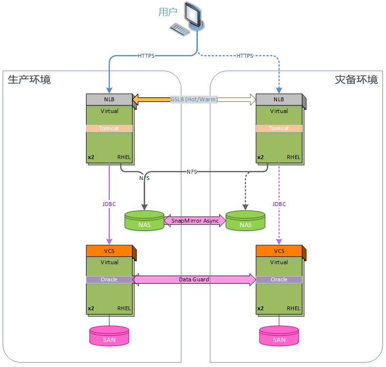 NAS在生产环境和灾备环境也备了两套,并进行了同步。一旦生产环境的NAS坏了,两台应用服务器可以挂到灾备NAS,并访问到已同步的文件。