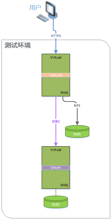 生产环境和灾备环境间应用服务器通过NAS(Network Attached Storage:网络附属存储,简单理解就是一种共享存储)保存文件,这样两套服务器间的文件是共享的,切换后也能访问到切换前的所有文件。