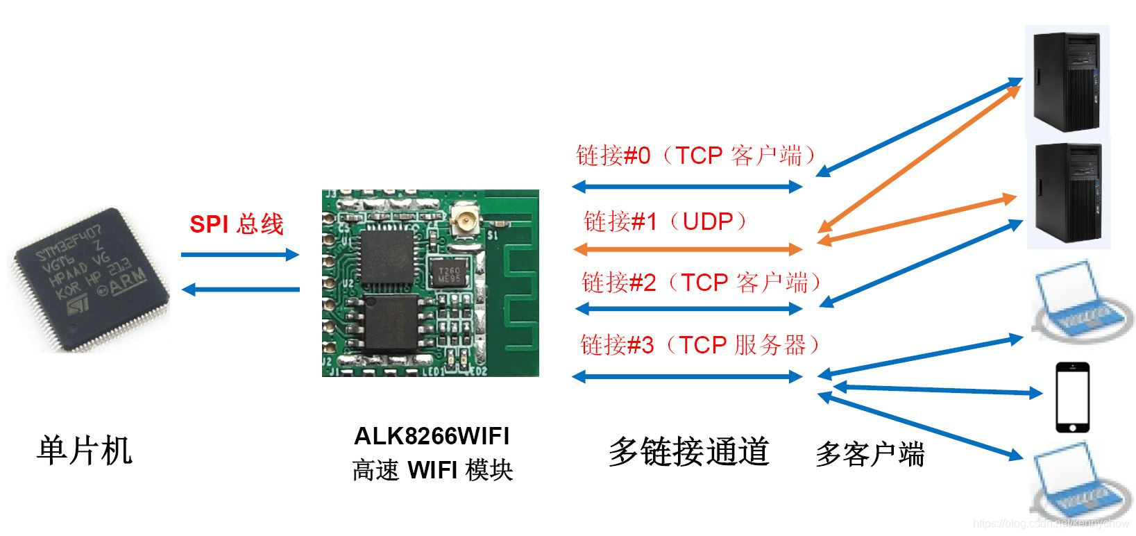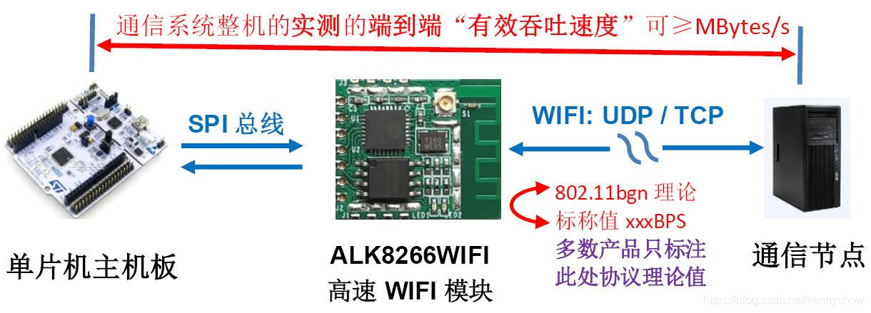 ALK8266WIFI, 基于SPI接口的高速WIFI模块,在多款普通单片机上,包括STM32系列及其兼容系列(如国产GD系列)、NXP系列(LPC和iMX跨接处理器)、TI DSP(如TMS320F28335)、Nuvoton新塘系列、C8051系列 ,以及一些国产单片机等多款常见的主流单片机主机,测试验证,实现了高速传输,普通环境下,实测有效速度可以超过兆字节每秒,长时间运行不掉线、不丢包,在单片机音视频传输、高速采集数据传输场合都得到了超过了一年以上的产品化的验证。而且集成简单(就象访问普通的SPI外设一样简单),占用单片机资源少(无需在单片机上集成操作系统或协议栈)。该方案功能强大、性能高、稳定,集成移植简单、适应面广,精致小巧。性价比超高。