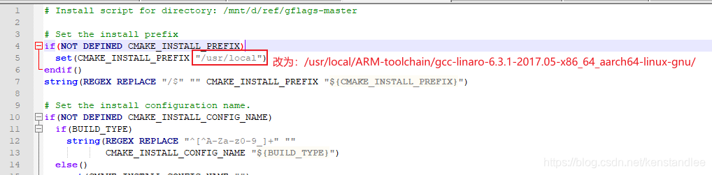 将"_build/cmake_install.cmake"文件内的"/usr/local"改为自己交叉编译器所在目录,例如,我的交叉编译器目录为“/usr/local/ARM-toolchain/gcc-linaro-6.3.1-2017.05-x86_64_aarch64-linux-gnu/"。