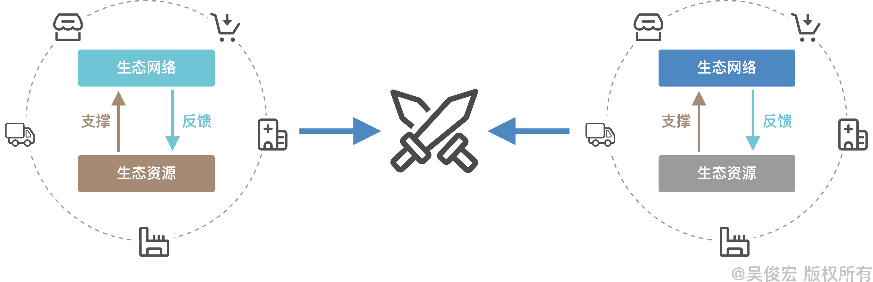 Gartner调研数据显示,中国有61%的企业已经参与别人的生态系统或自建生态系统。比如阿里和腾讯之间的竞争,不是淘宝和微信这两个产品的竞争,而是围绕电商交易与围绕社交形成的两个生态系统之间,在零售、娱乐、出行、旅游、金融、物流、社交、电商、云计算等多领域、全方位的生态竞争。未来不再是产品之间、企业之间或者产业链之间的竞争,而是企业连接形成的生态系统之间的竞争。