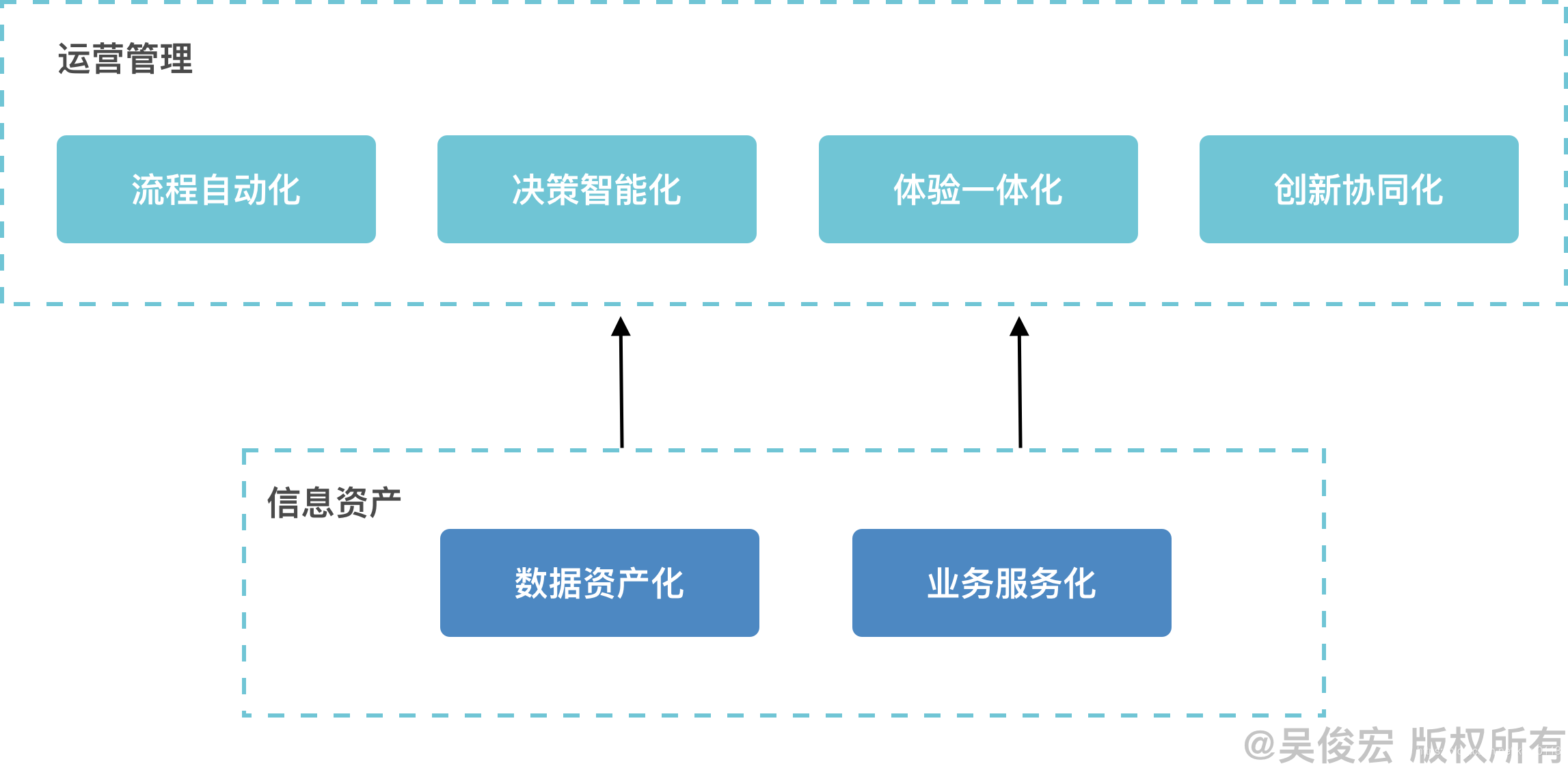 如果未来企业是一艘宇宙飞船,那么信息资产就是飞船的动力系统——发动机,运营管理则是飞船的主体——船身,用户体验和业务规划则是飞船的左右机翼。