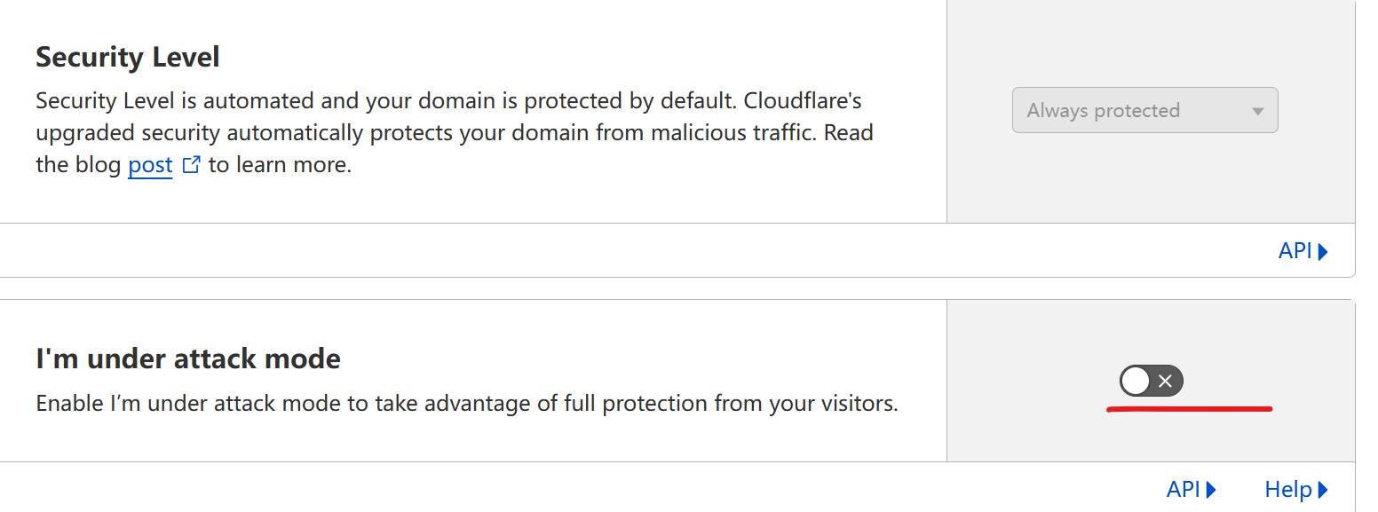 点击打开I'm under attack mode,即可要求所有请求必须通过人机验证,通过后方可请求网站