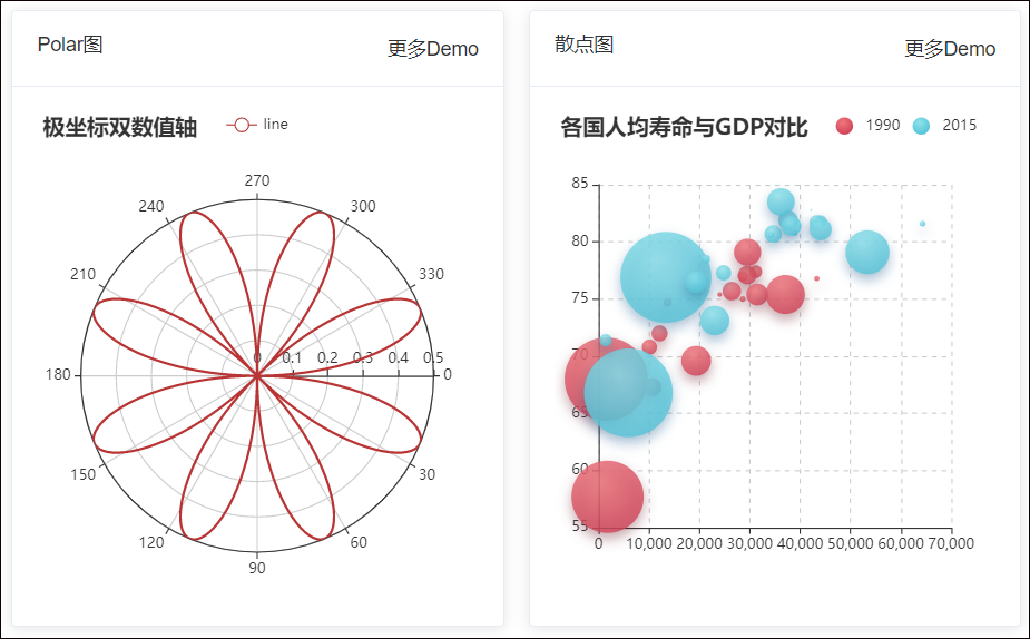 以上就是基于vue-echarts处理各种图表展示,其中常规的引入组件很容易的,主要就是需要根据对应的图表案例,参考数据组成的规则,从而根据我们实际情况构建对应的数据,赋值给对应的模型变量即可。