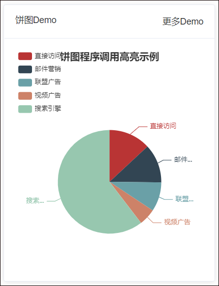 export default { title: { text: '饼图程序调用高亮示例', x: 'center' }, tooltip: { trigger: 'item', formatter: '{a} <br/>{b} : {c} ({d}%)' }, legend: { orient: 'vertical', left: 'left', data: ['直接访问', '邮件营销', '联盟广告', '视频广告', '搜索引擎'] }, series: [ { name: '访问来源', type: 'pie', radius: '55%', center: ['50%', '60%'], data: [ { value: 335, name: '直接访问' }, { value: 310, name: '邮件营销' }, { value: 234, name: '联盟广告' }, { value: 135, name: '视频广告' }, { value: 1548, name: '搜索引擎' } ], itemStyle: { emphasis: { shadowBlur: 10, shadowOffsetX: 0, shadowColor: 'rgba(0, 0, 0, 0.5)' } } } ] }