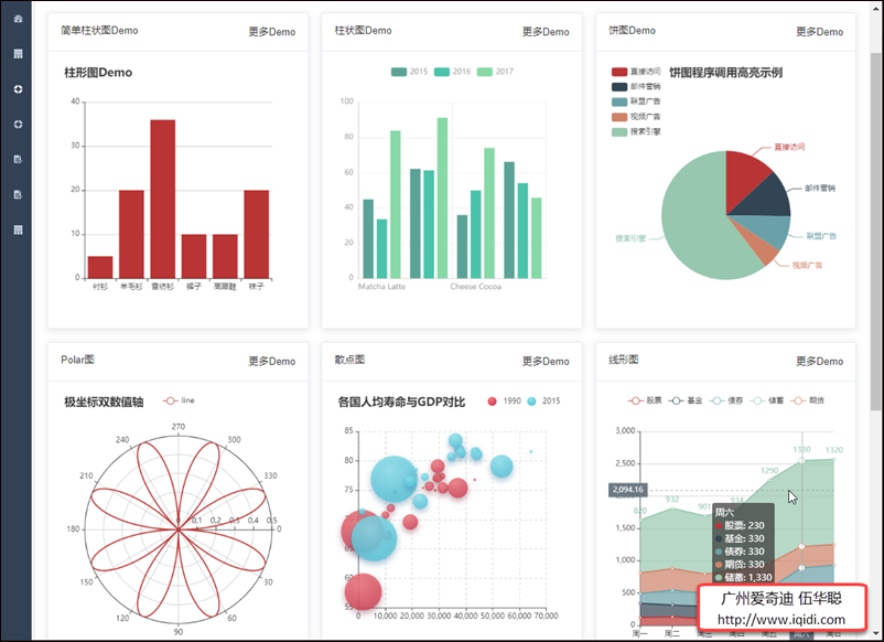 在我们做应用系统的时候,往往都会涉及图表的展示,综合的图表展示能够给客户带来视觉的享受和数据直观体验,同时也是增强客户认同感的举措之一。基于图表的处理,我们一般往往都是利用对应第三方的图表组件,然后在这个基础上为它的数据模型提供符合要求的图表数据即可,VUE+Element 前端应用也不例外,我们这里使用了基于vue-echarts组件模块来处理各种图表vue-echarts是对echarts图表组件的封装。
