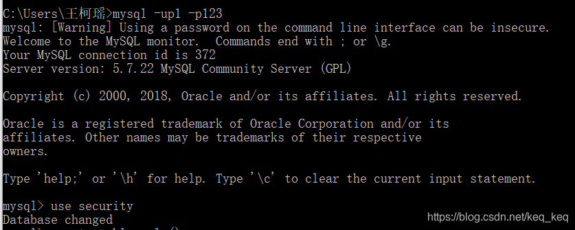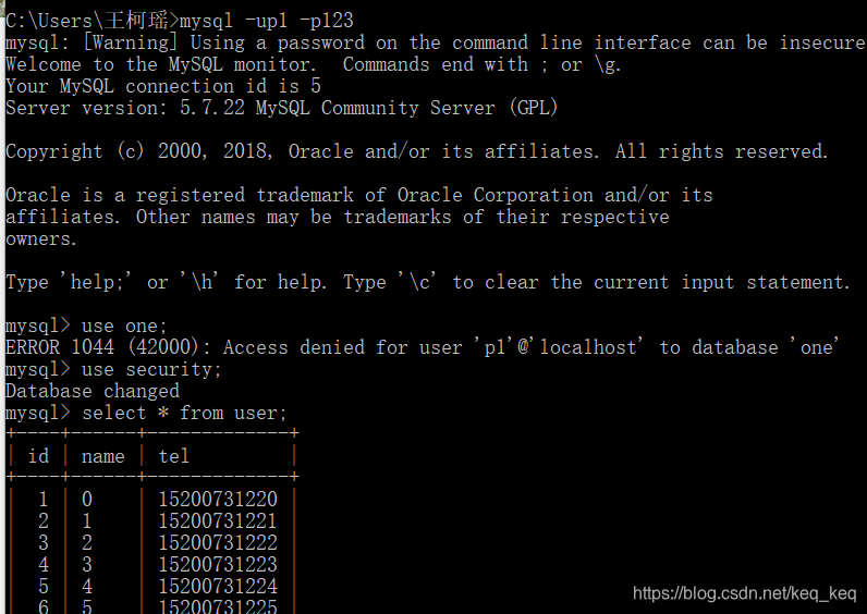 登录p1用户进行数据查询,且仅限于使用数据库 security!