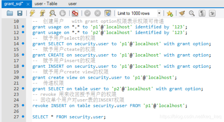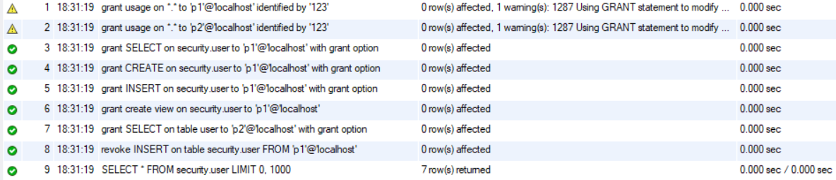 创建用户p1,p2对security.user的一些权限赋予: