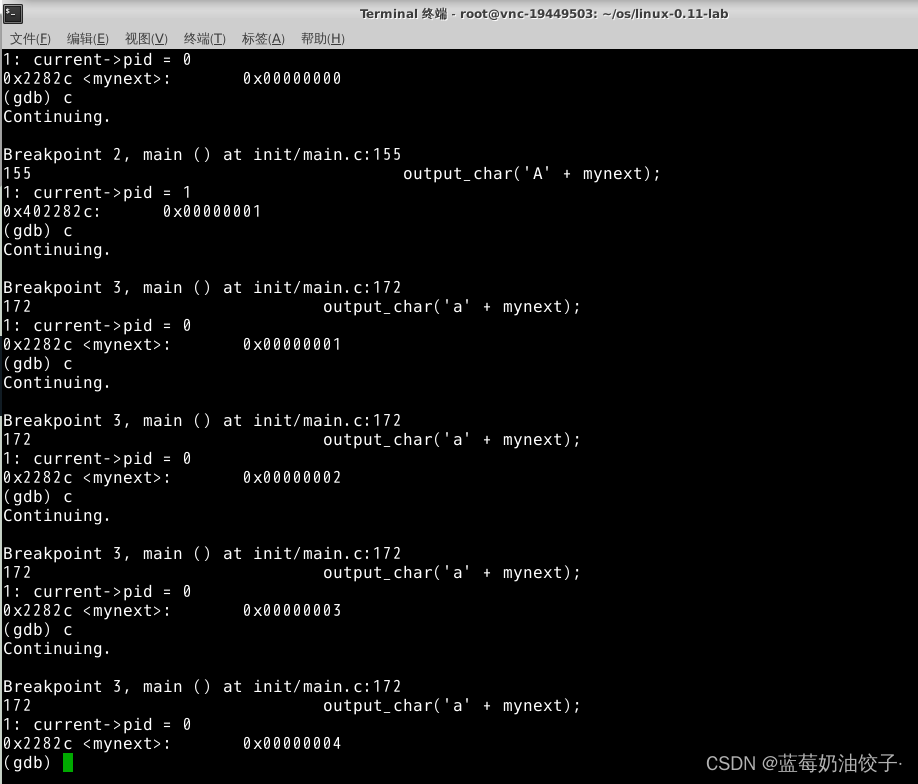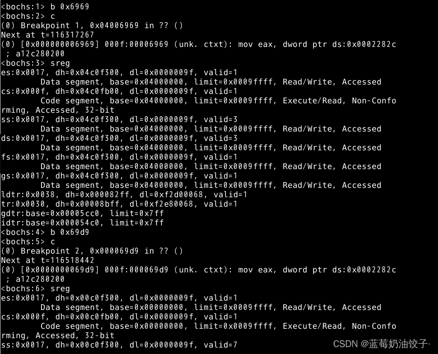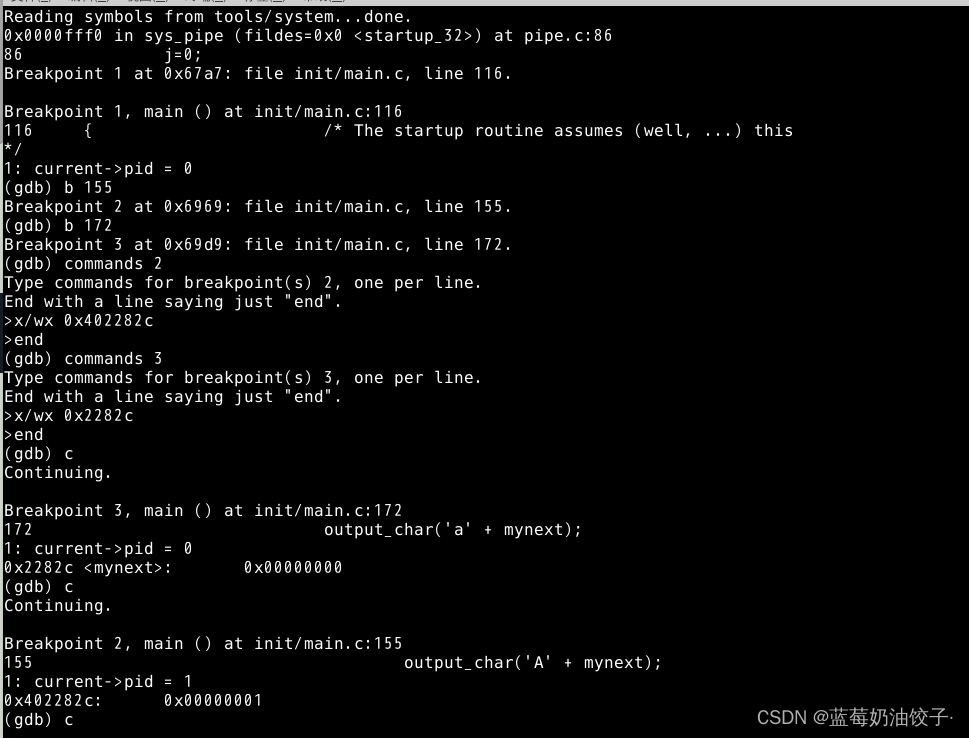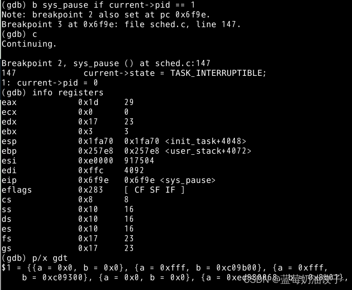 文章是关于操作系统的内核调试,主要关注0号和1号进程在执行特定函数时mynext变量的变化,LDTR寄存器的值以及数据段和代码段的段基址。通过使用gdb调试器设置断点并检查寄存器和内存状态来解答一系列问题,涉及进程间的内存管理和段描述符的内容。