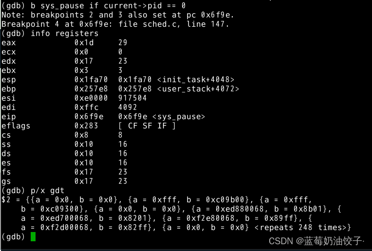 1.0 号进程执行到 sys_pause 时,默认数据段(CS)和默认数据段(DS)的值分别是多少?其基地址分别是多少? 2.1 号进程执行到 sys_pause 时,默认数据段(CS)和默认数据段(DS)的值分别是多少?其基地址分别是多少?
