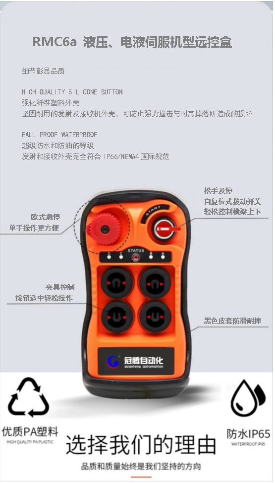 本文介绍了RMC6电液机型的远控盒,特别关注了有线版RMC6a的设计特点,如防止跌落的控制线出口位置、内置CPU和EEPROM带来的可编程功能,以及无线版的无线通讯性能和操作的盲操纵特性,提升了操作舒适性和效率。