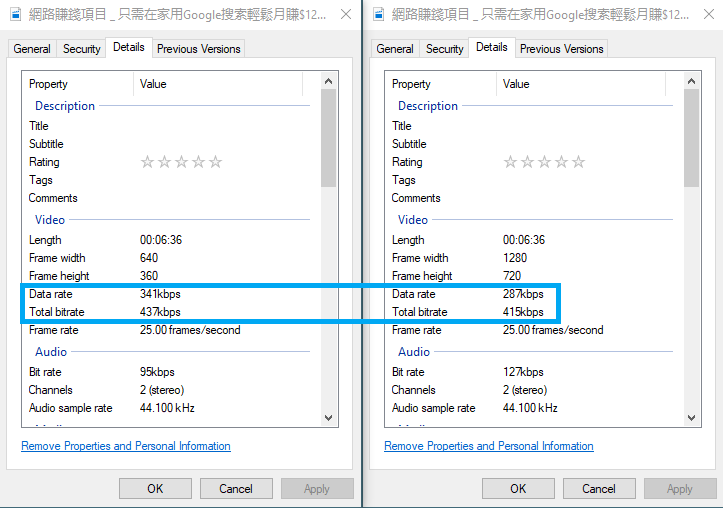 看下属性,时间&帧率一样,纵向和横向的扫描线数量也是中规中矩(640*360以及1280*720),音频略有区别不过相比视频体积一般忽略不计。