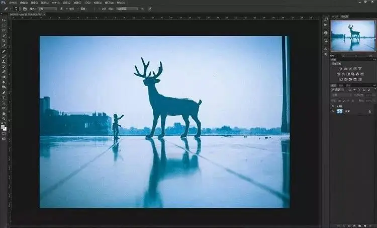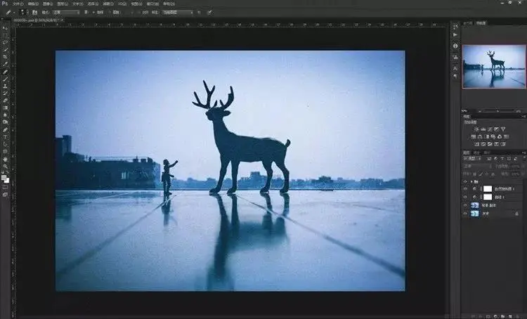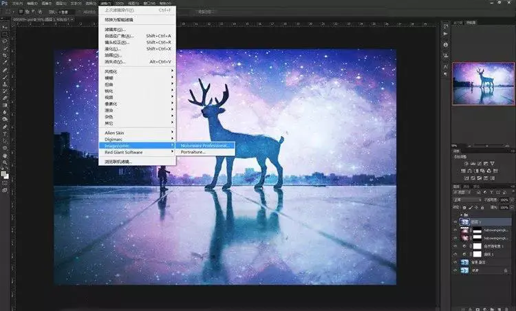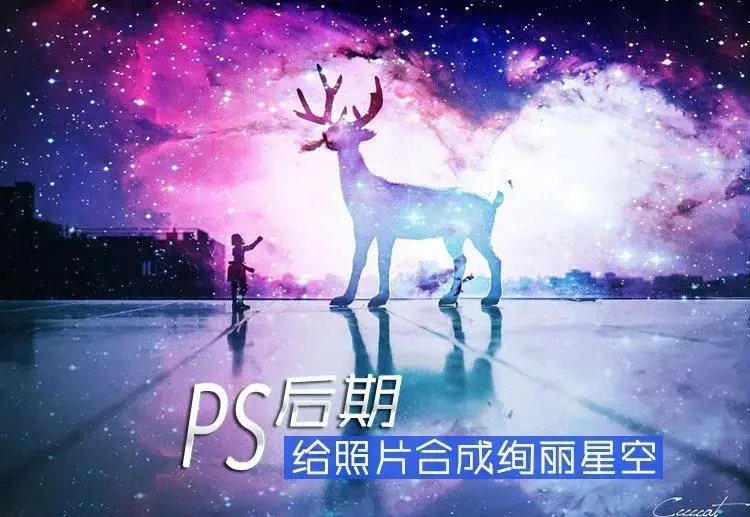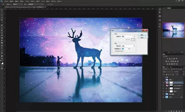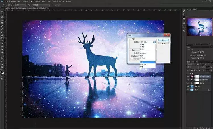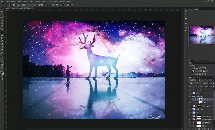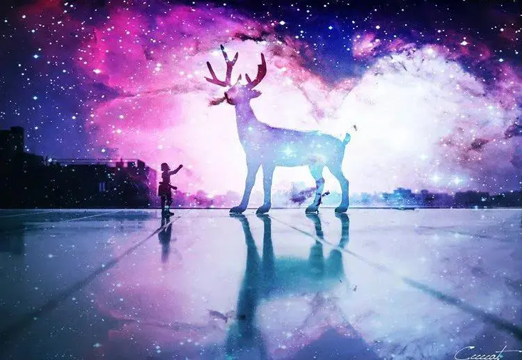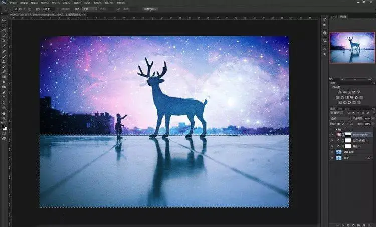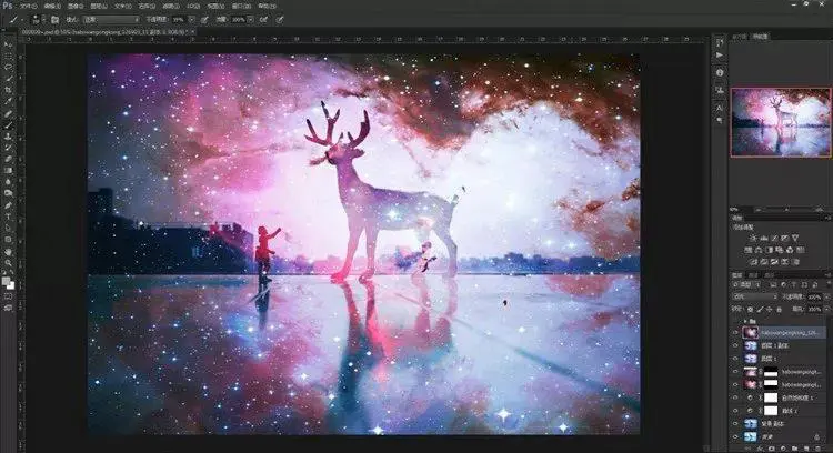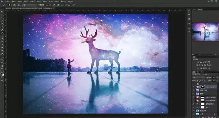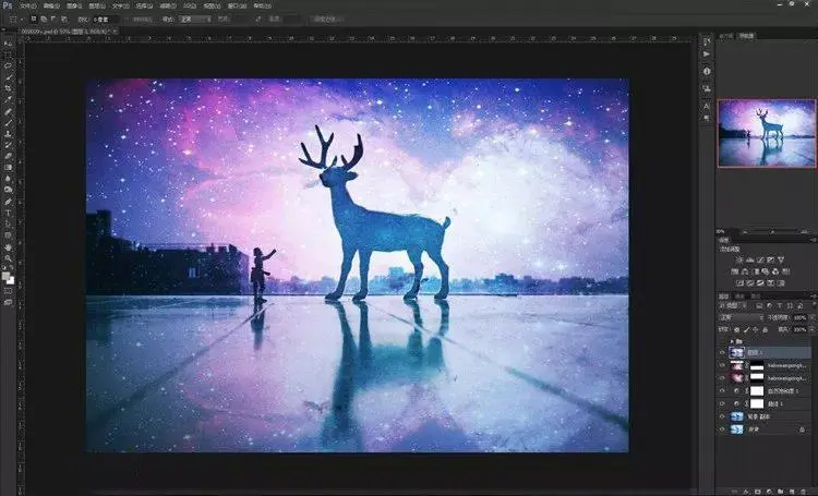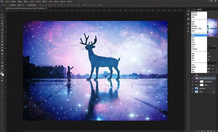 9、其实到这一步已经大概可以看到效果了,星空已经叠加进入了画面里。但是,仔细看看还是有些不够完美!我们现在来给小鹿再进一步“融入星空”。步骤依然是再导入这张素材,然后不同的是混合模式不是“叠加”,而是选择“点光”。