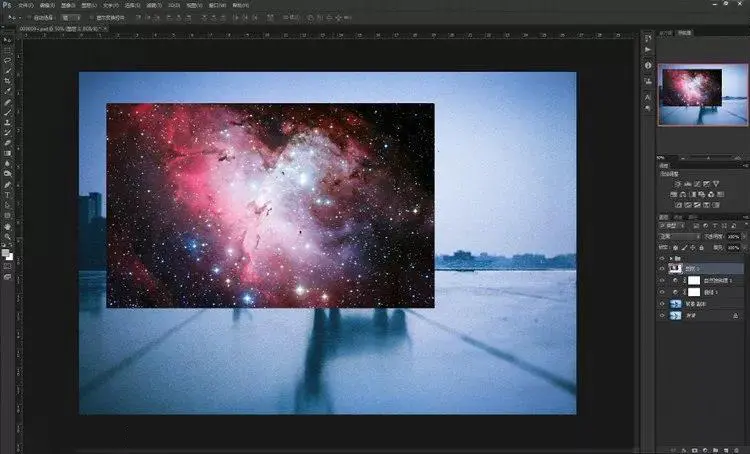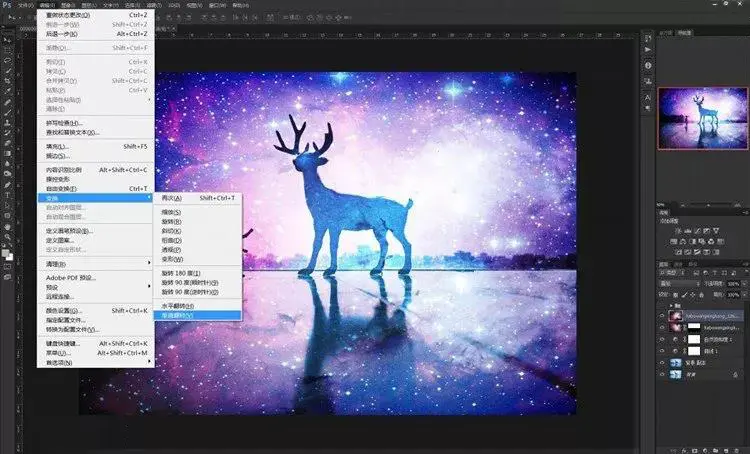 6、做完了室外的“星空”,那我们现在得再做一个室内的倒影效果,以增加画面的逼真感和合理性。同样的,我们重复之前第一至第四步的操作,再一次导入这张素材,混合模式为“叠加”。然后选择“编辑” > “变换” > “垂直反翻转”图片。