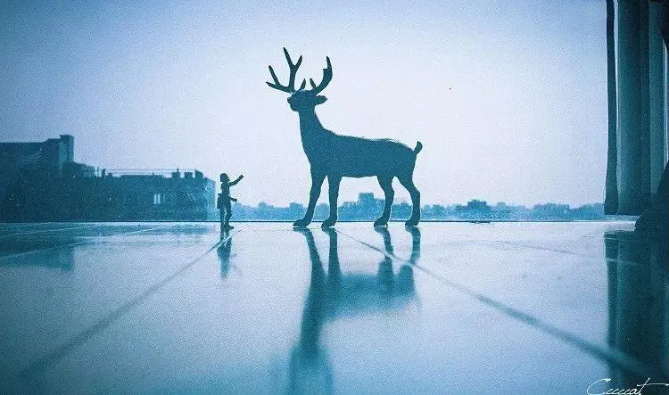 10、运用蒙板,我们把小鹿画出来。我的步骤是:添加黑色蒙板(通常点击添加蒙板是白色的,如何直接添加黑色蒙板呢?我们按住Alt键然后鼠标点击添加蒙板即可),用颜色为白色的画笔工具(快捷键B)在小鹿身上涂抹,把小鹿“画出来”。ps:有朋友会问蒙板是什么?恕猫表达能力有限……这是PS基础知识,实在不明白请百度。