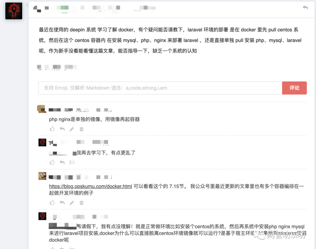 刚开始学Docker的时候因为不知道Docker跟以前在VirtualBox里安的虚拟机还有Vargrant有啥区别,我都是习惯性的把开发环境里用的东西往单个容器里塞。后来看网上的教程还有别人分享的案例多了后,才知道把应用容器化的第一步是:要把应用用到的东西拆解放到多个容器里。慢慢地我发现不少人刚开始学Docker时候跟我一样都有刚接触时把Docker当虚拟机来用的问题,比如我特别早以前发过一篇文章《用Docker-Compose搭建Laravel开发环境》里,我用三个分别装着PHP、MySQL和Nginx的容器搭建了一个开发环境。有读者就问了这么一个问题: