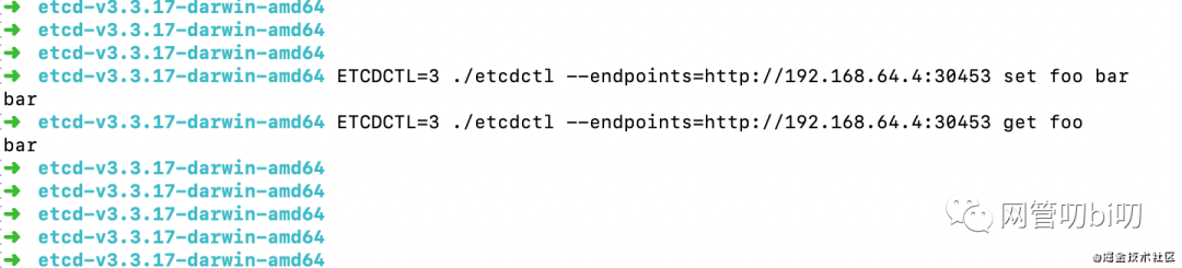 测试安装是否成功也简单,观测Pod在Kubernetes里都正常启动起来后我们往Etcd里 set 一个键值,看能不能再查询出来就行了。