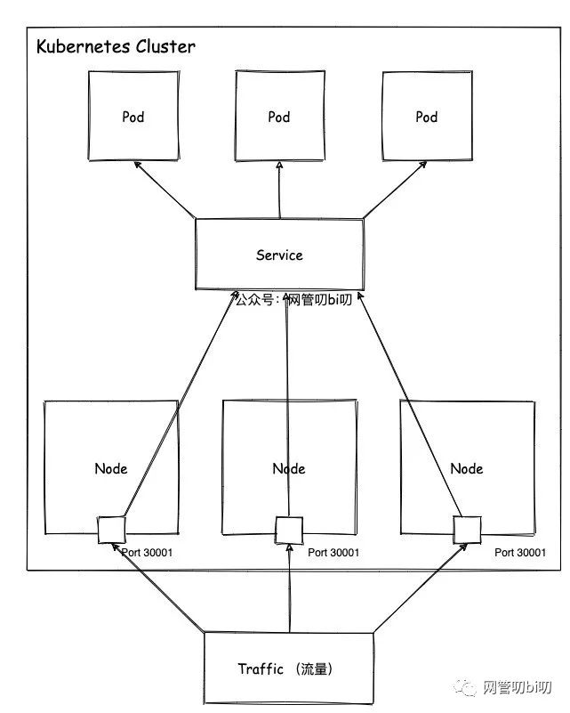 上图我们顺着流量的流向箭头从下往上看,流量通过NodeIP+NodePort的方式进入集群,上图三个节点的30001上的流量都会转发给Service,再由Service给到后端端点Pod。