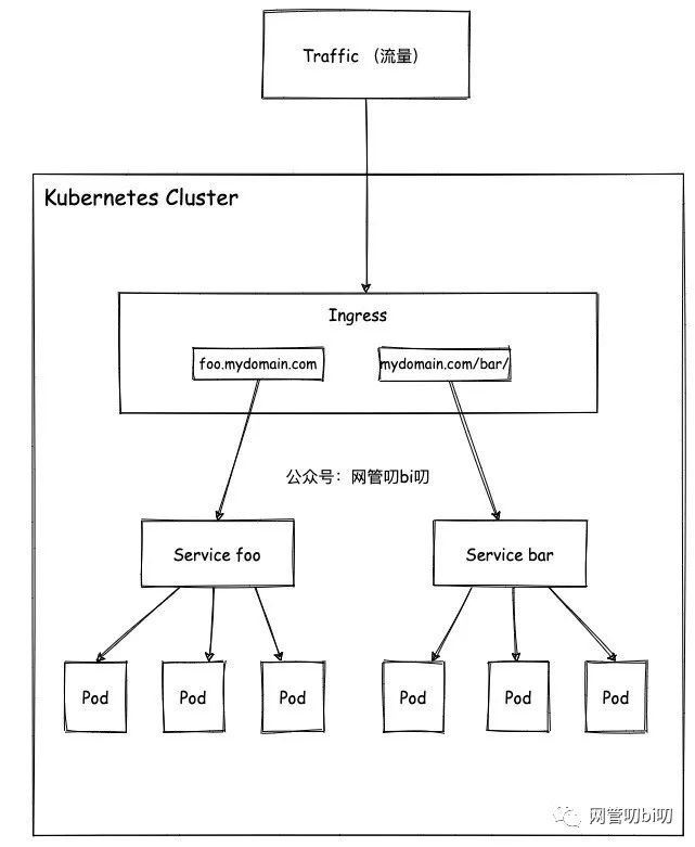 我们可以把这张图和上面NodePort原理图做一个比较,看看两者的区别。上面这个示意图对应的Ingress资源声明文件差不多应该长这个样子: