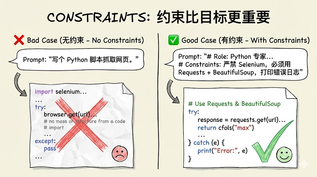 优化后:“写个 Python 脚本抓取网页。注意:严禁使用 Selenium,必须使用 Requests + BeautifulSoup。如果没有找到目标元素,必须打印错误日志而不是直接抛出异常。”