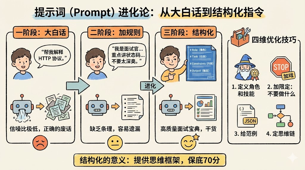 今天咱们就专门聊聊:从一句“大白话”开始,怎么通过三个阶段的进化,把它变成一个能干活的“结构化指令”。