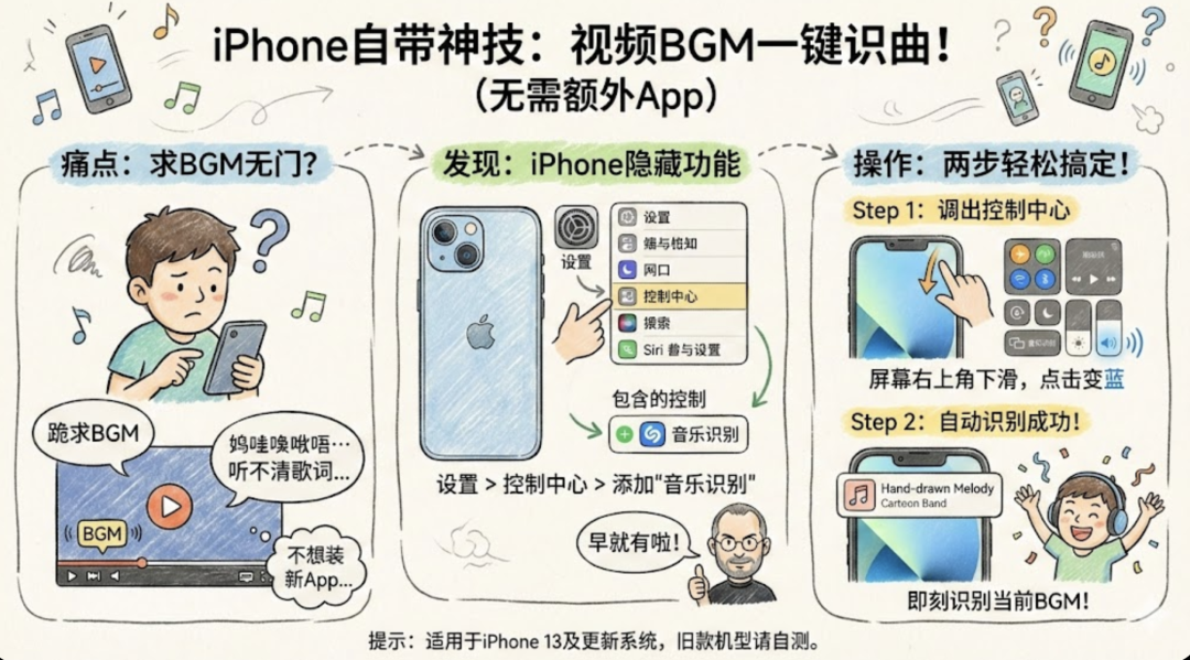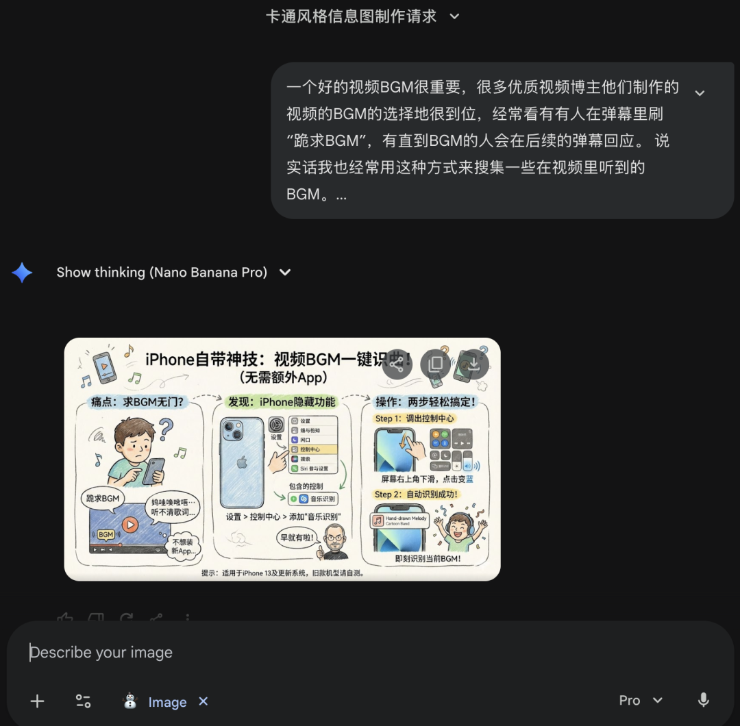 这张图很好得提炼出了我在文章里描述得怎么打开iPhone自带的BGM识别功能,并成功识别到了视频BGM的信息。 这篇文章在这里 iPhone的一个隐藏功能,不再跪求BGM,大家可以看看感受一下图片对文章内容信息提炼得怎么样,也可以用这个提示词来提炼你想看的其他内容。