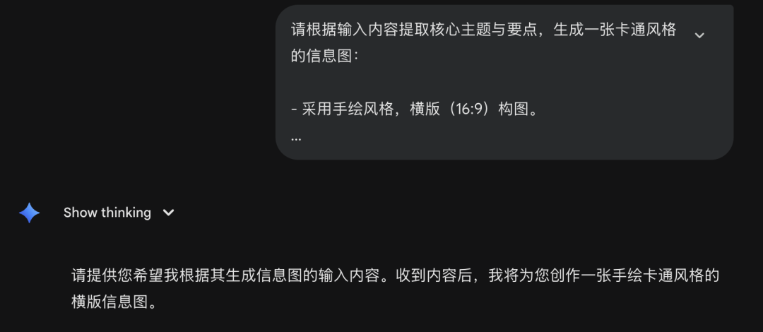 输入提示词后AI 会等着我们输入要提炼成信息图的内容,也可把内容粘贴到提示词 Input 区块下,让AI直接生成。
