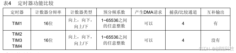 2.3.15 定时器和看门狗 中等容量的STM32F103xx增强型系列产品包含1个高级控制定时器、3个普通定时器,以及2个看门 狗定时器和1个系统嘀嗒定时器。 下表比较了高级控制定时器、普通定时器和基本定时器的功能: