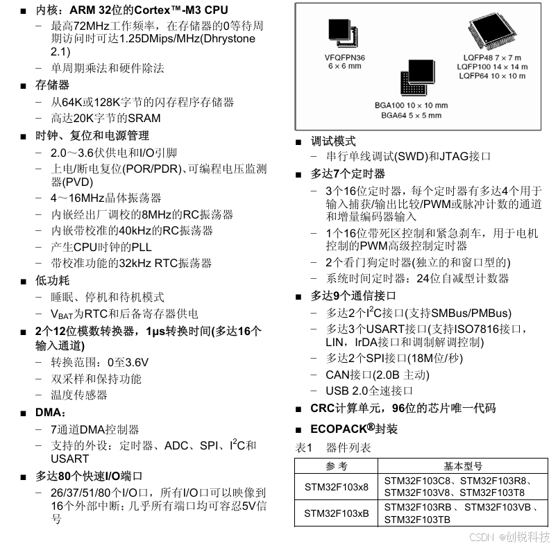 STM32F103x8和STM32F103xB增强型系列使用高性能的ARM® Cortex™-M3 32位的RISC内核,工 作频率为72MHz,内置高速存储器(高达128K字节的闪存和20K字节的SRAM),丰富的增强I/O端口 和联接到两条APB总线的外设。所有型号的器件都包含2个12位的ADC、3个通用16位定时器和1个 PWM定时器,还包含标准和先进的通信接口:多达2个I2C接口和SPI接口、3个USART接口、一个 USB接口和一个CAN接口。