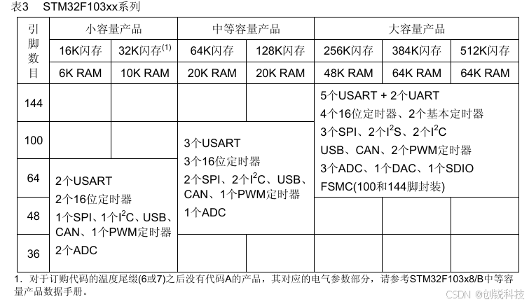 STM32F103xx是一个完整的系列,其成员之间是完全地脚对脚兼容,软件和功能上也兼容。在参考 手册中,STM32F103x4和STM32F103x6被归为小容量产品,STM32F103x8和STM32F103xB被归 为中等容量产品,STM32F103xC、STM32F103xD和STM32F103xE被归为大容量产品。