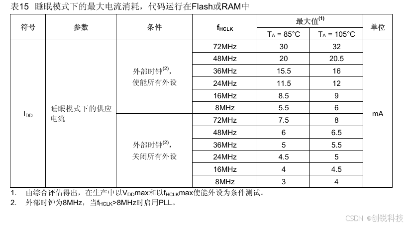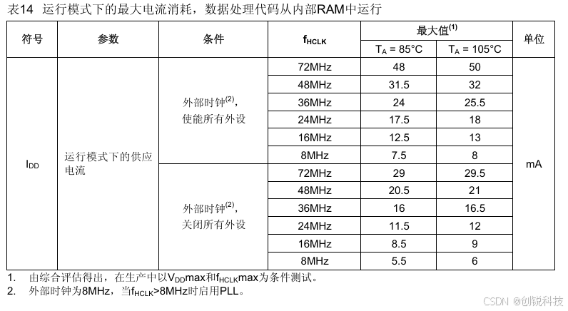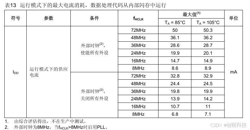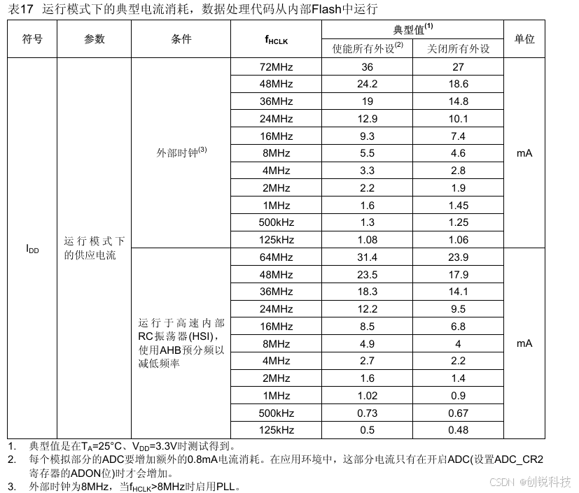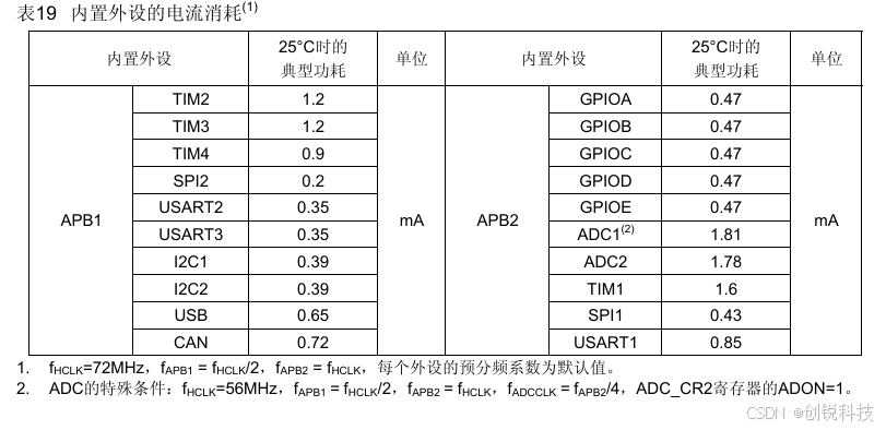 2. 每个模拟部分的ADC要增加额外的0.8mA电流消耗。在应用环境中,这部分电流只有在开启ADC(设置ADC_CR2 寄存器的ADON位)时才会增加。