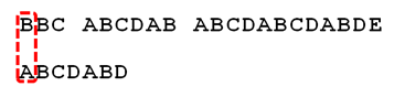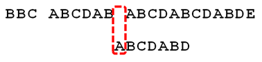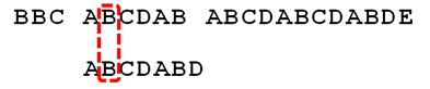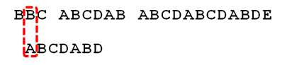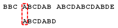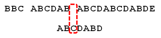 还是给定文本串"BBC ABCDAB ABCDABCDABDE",和模式串"ABCDABD",现在要拿模式串去跟文本串匹配,如下图所示: