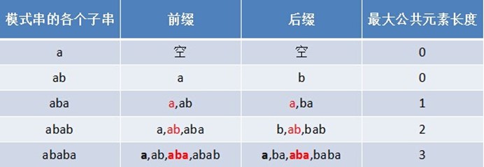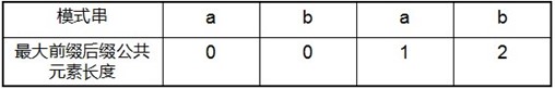 对于P = p0 p1 ...pj-1 pj,寻找模式串P中长度最大且相等的前缀和后缀。如果存在p0 p1 ...pk-1 pk = pj- k pj-k+1...pj-1 pj,那么在包含pj的模式串中有最大长度为k+1的相同前缀后缀。举个例子,如果给定的模式串为"abab",那么它的各个子串的前缀后缀的公共元素的最大长度如下表格所示: