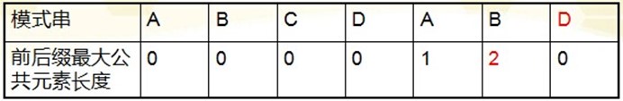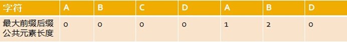 由上文,我们已经知道,字符串"ABCDABD"各个前缀后缀的最大公共元素长度分别为: