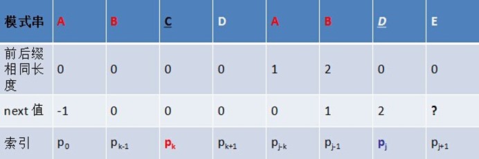 怎么办呢?既然没有长度为4的相同前缀后缀,咱们可以寻找长度短点的相同前缀后缀,最终,因在p0处发现也有个字符D,p0 = pj,所以p[j]对应的长度值为1,相当于E对应的next 值为1(即字符E之前的字符串"DABCDABD"中有长度为1的相同前缀和后缀)。