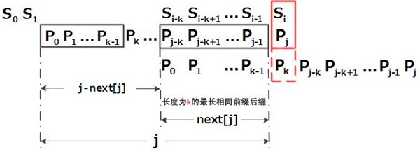 匹配失配,j = next [j],模式串向右移动的位数为:j - next[j]。换言之,当模式串的后缀pj-k pj-k+1, ..., pj-1 跟文本串si-k si-k+1, ..., si-1匹配成功,但pj 跟si匹配失败时,因为next[j] = k,相当于在不包含pj的模式串中有最大长度为k 的相同前缀后缀,即p0 p1 ...pk-1 = pj-k pj-k+1...pj-1,故令j = next[j],从而让模式串右移j - next[j] 位,使得模式串的前缀p0 p1, ..., pk-1对应着文本串 si-k si-k+1, ..., si-1,而后让pk 跟si 继续匹配。如下图所示: