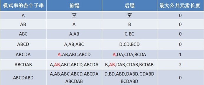 如果给定的模式串是:"ABCDABD",从左至右遍历整个模式串,其各个子串的前缀后缀分别如下表格所示: