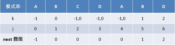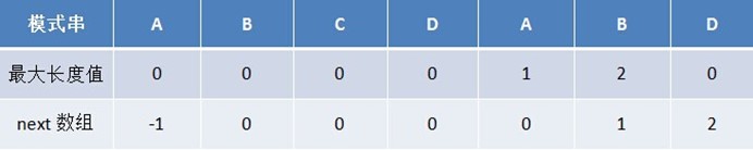 换言之,对于给定的模式串:ABCDABD,它的最大长度表及next 数组分别如下: