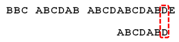 5. 继续比较,发现D与C 失配,故向右移动的位数为:已匹配的字符数6减去上一位字符B对应的最大长度2,即向右移动6 - 2 = 4 位。