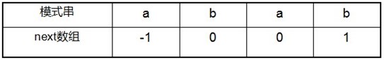 next 数组考虑的是除当前字符外的最长相同前缀后缀,所以通过第①步骤求得各个前缀后缀的公共元素的最大长度后,只要稍作变形即可:将第①步骤中求得的值整体右移一位,然后初值赋为-1,如下表格所示: