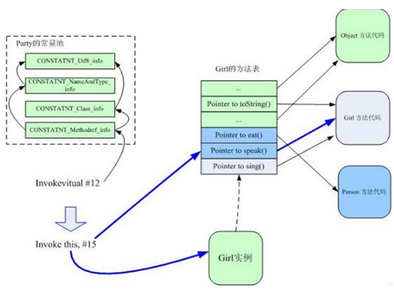 设该调用代码对应着 girl.speak(); #12 是 Person类的常量池的索引。JVM 执行该调用指令的过程如下所示: