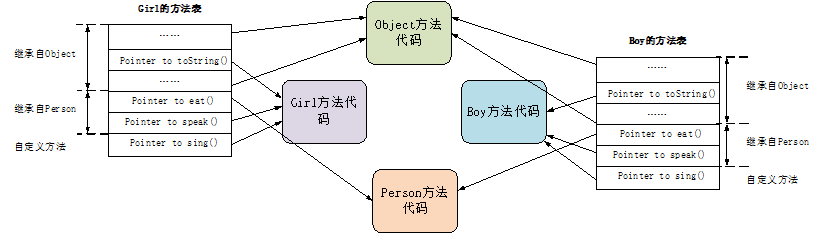 可以看到,Girl 和 Boy 的方法表包含继承自 Object 的方法,继承自直接父类 Person 的方法及各自新定义的方法。注意方法表条目指向的具体的方法地址,如 Girl 继承自 Object 的方法中,只有 toString() 指向自己的实现(Girl 的方法代码),其余皆指向 Object 的方法代码;其继承自于 Person 的方法 eat() 和 speak() 分别指向 Person 的方法实现和本身的实现。