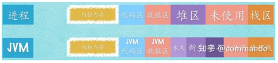 上图特别强调了JVM进程模型的代码区和数据区指的是JVM自身的,而非Java程序的。普通进程栈区,在JVM一般仅仅用做线程栈。JVM的堆区和普通进程的差别是最大的,下面具体详细说明: